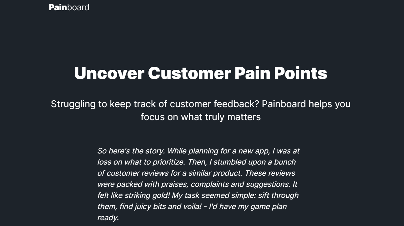 Painboard is an AI assistant that helps you focus on customer pain points, it analyzes customer reviews and provides valuable insights.