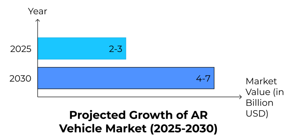 From 2 to 3 billion U.S. dollars by 2025, the AR Vehicle Market is expected to grow to 4 to 7 billion U.S. dollars in 2030. (Statista, 2023)