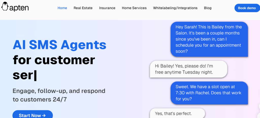 Apten, for instance, is an AI SMS Agents offers 24/7 customer engagement, follow-ups, and responses, making it easier to schedule appointments and handle inquiries.