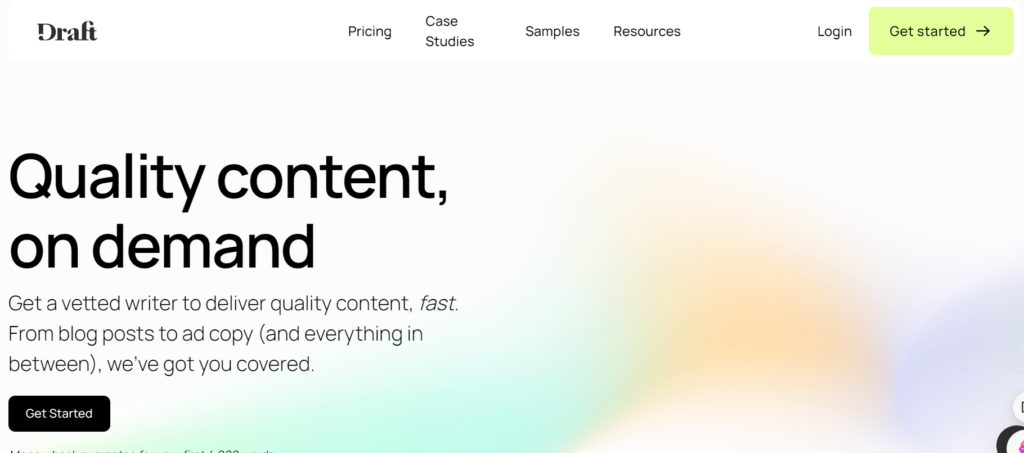 Draft, to illustrate, provides on-demand content through AI workflows and vetted writers. The process is streamlined, and you will receive publish-ready content with free revisions.
