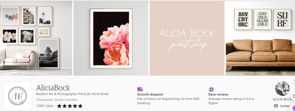 Alicia Bock, to illustrate, is a fine art photographer and sells her artwork on Etsy. Alicia offers a diverse range of art inspired by her life in Michigan and Florida. Her work has been featured in popular media like “Sex and the City 2” and magazines such as “Real Simple” and “Better Homes and Gardens.”