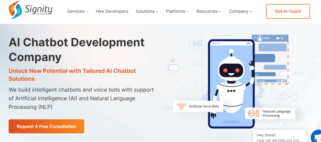 Signity Solutions, for example, specializes in AI chatbot development, offering tailored solutions that integrate AI and NLP for improved customer interactions.