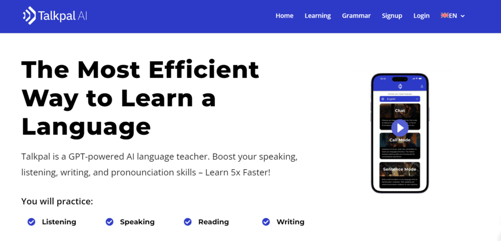 Talkpal, for example, is an AI language teaching app designed by utilizing GPT to improve your speaking, listening, reading, and writing skills.
