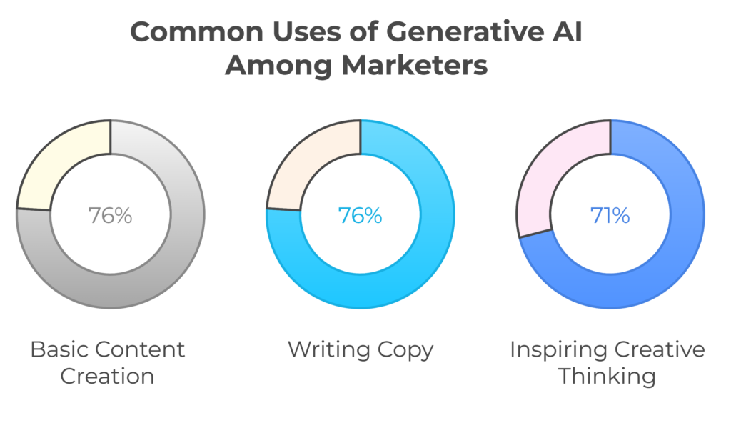 7. The most common uses of generative artificial intelligence among marketers are basic content creation (76%), writing copy (76%), and inspiring creative thinking (71%). (Salesforce, 2023)