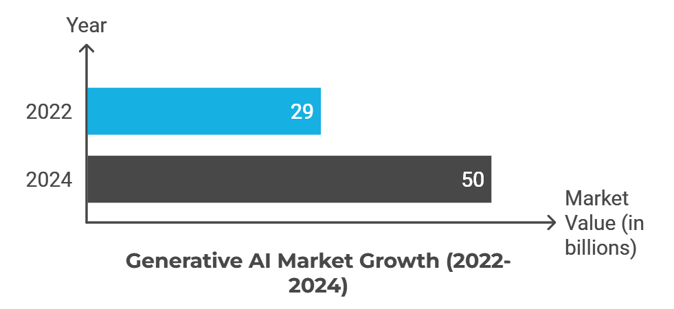 1. The generative AI market value was only $29 billion in 2022 and has grown to approximately $50 billion today – a 54.7% market growth from 2022 to 2024. (Statista, 2024)