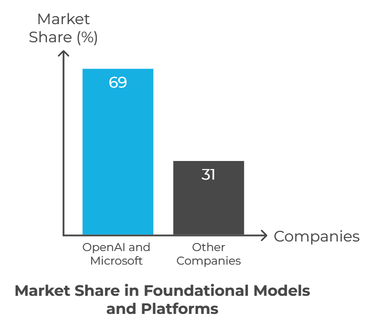 2. OpenAI and Microsoft have a combined share of 69% in the foundational models and platforms market. Foundation models are key to generative AI because they can adapt to a lot of tasks by fine-tuning the model instead of completing retraining. (IoT Analytics, 2023)