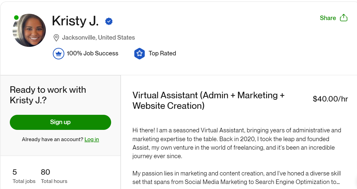 Kristy J., for instance, a seasoned virtual assistant from Jacksonville, United States, offers a diverse skill set in administrative tasks and marketing, including website creation.