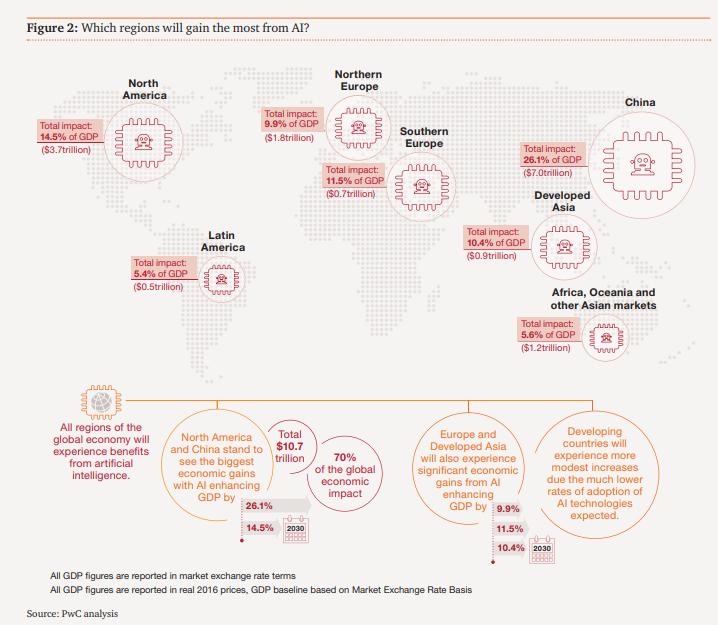 5. Regarding regional benefits, experts predict China will receive the greatest gains (26%) from AI development, with a GDP boost of at least $7 trillion. Following next is North America, with a 14% GBP boost. (PWC)
