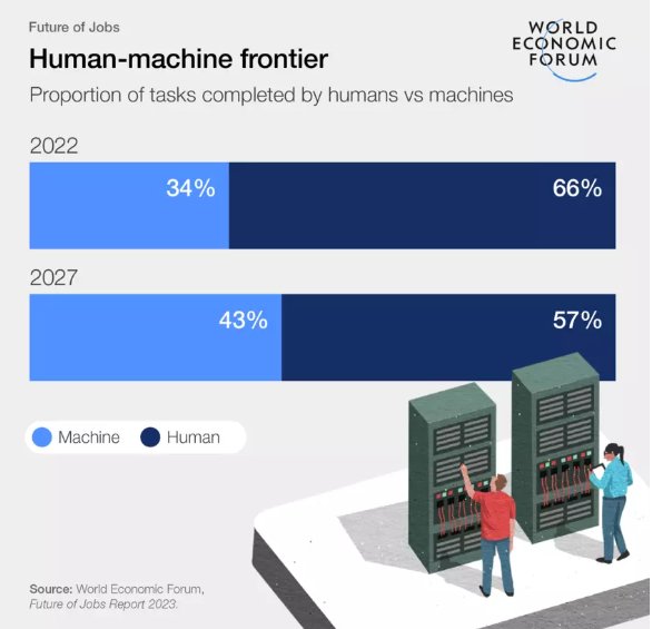 1. In 2027, about 43% of tasks will be completed by AI, compared to 34% of tasks in 2022. (WEF)