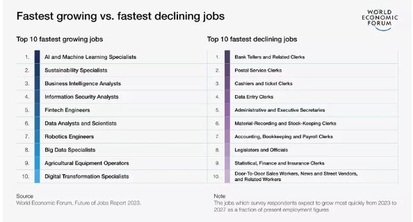 1. A majority of the fastest-growing roles are technology-related. Some of the largest growing jobs between 2023 and 2027 include AI and machine learning specialists, sustainability specialists, business intelligence specialists, information security analysts, and fintech engineers. (WEF)
