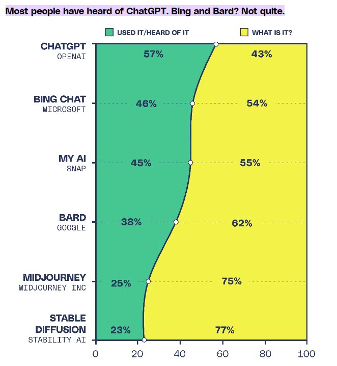 12. 57% of people have heard about Chat GPT, 46% Bing Chat, 38% Google Bard, 25% MidJourney, and 23% Stable Diffusion. (The Verge)