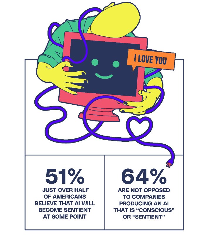 16. 51% of Americans think AI will become sentient in the future, while 64% are not against creating conscious artificial intelligence. (The Verge)