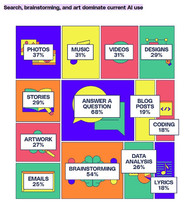1. Art constitutes a large use of current AI implementation, with photos accounting for 37%, music at 31%, videos at 31%, designs at 29%, and artwork at 27%. (The Verge)