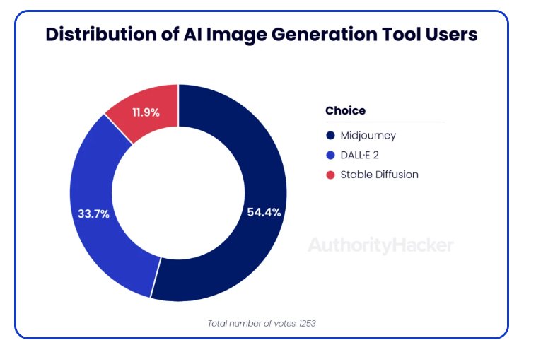 6. When using AI image generation tools, MidJourney and DALL-E-2 dominated the market at 54.4% and 33.7%, respectively. (Authority Hacker)