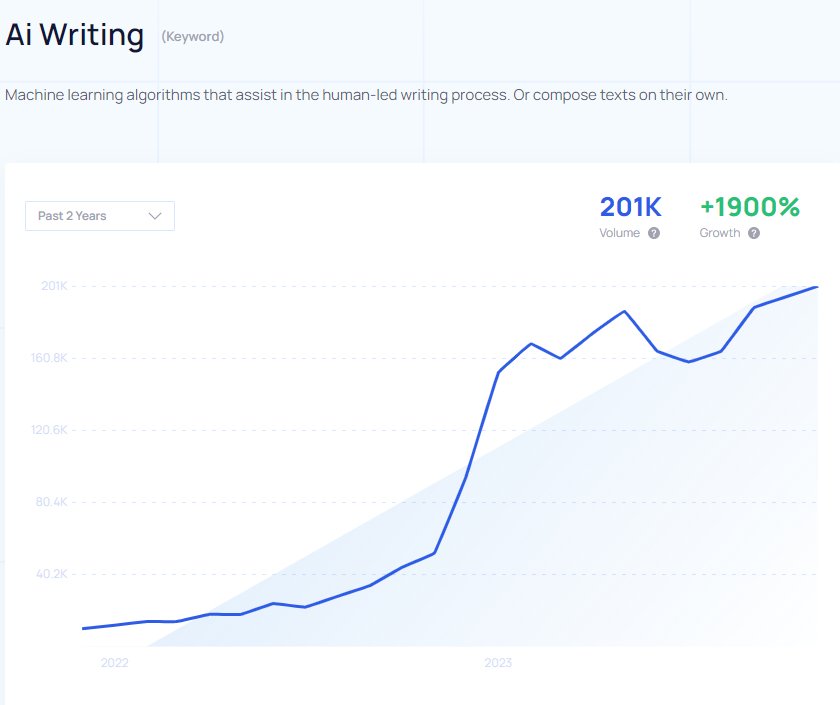 9. Businesses and individuals consistently use machine learning algorithms when writing or composing texts. The search volume for AI writing tools had a 1900% growth rate, with about 201k searches in 2023 alone. (Exploding Topics)