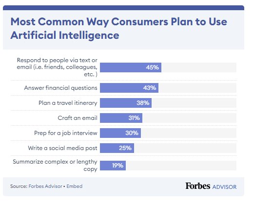 2. 45% of people use AI as an assistant when replying to texts and emails. Another 43% use these automation tools to find answers to financial questions. (Forbes Advisor)
